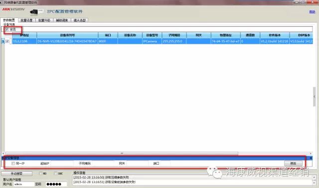 操作步骤:打开软件,选中需要修改IP的摄像头,在下方输入起始IP,子网掩码,网关和端口号后,点击修改。