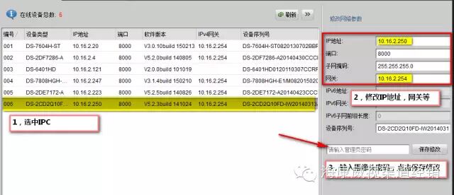 你会搜到同一个交换机/直连的海康设备。选中IPC,在右侧修改IP,输入密码,点击保存就完成修改IP的任务啦~如果修改后摄像头的IP和你的电脑IP在同一网段(一般为前3位一样,如:我电脑IP是10.16.2.113,摄像头的IP是10.16.2.250,前三位相同,那么电脑和摄像头就在同一网段。)就可以在IE浏览器里输入该IP,进行预览、配置等操作了。(自己电脑的IP是多少呢?百度一下吧!)