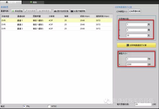 3,在右边输入计划录像的时间,点击“对所有通道进行计算”。