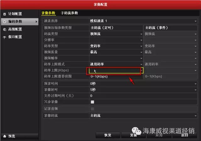 进入录像机【主菜单】-【录像配置】-【编码参数】。